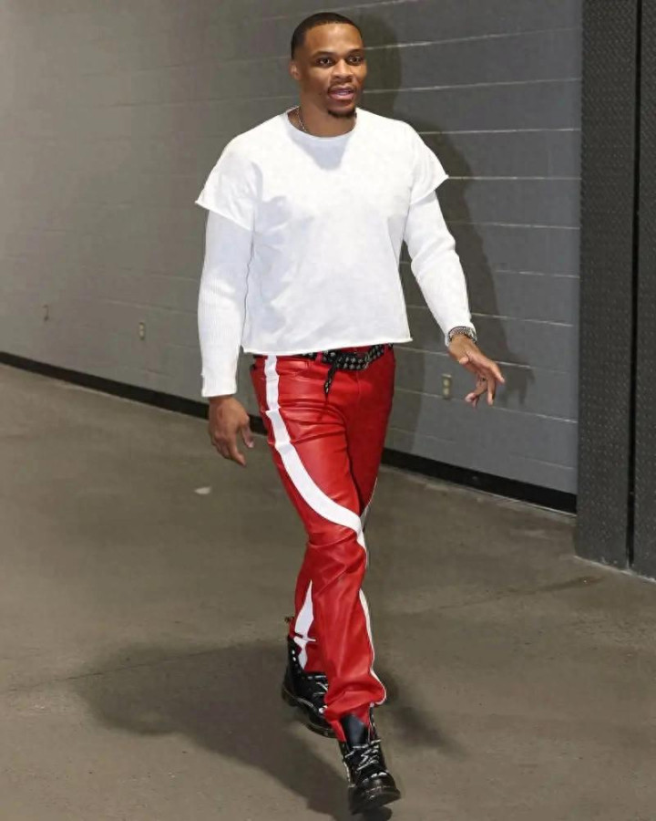 外面搭配的是一条红色亮面皮裤,标记的红色瞬息成为了整个这个词穿搭的视觉焦点。亮面的材质在光泽的映照下闪闪发光,极具前锋感和将来感。这种斗胆的样式选拔与惯例的玄色、蓝色裤子酿成了显明的对比,彰显出威斯布鲁克专有的个性和勇于碎裂的前锋立场。皮裤的版型修身,牢牢包裹着他的双腿,既展现出他的腿部线条,又增添了一份干练与洒脱。