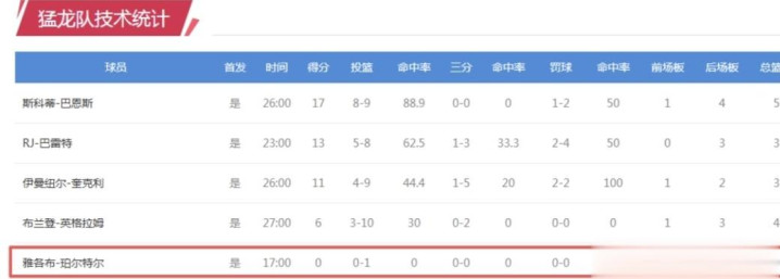 值得一提的是猛龙队的珀尔特尔在本场对阵尼克斯的比赛中,首发出场17分钟,投篮1中0,拿下0分0板的莫名数据。