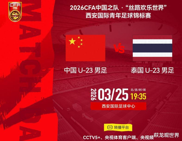 北京时间3月25日晚19:35,西安,央视将镜头瞄准西安海外足球中心畅通场。2026年CFA中国之队-西安海外后生足球锦标赛一场焦点大战,中国U23男足迎战泰国U23男足!央视体育赛事频谈CCTV5+将进行现场直播!球迷也可通过央视频、央视体育客户端等蚁集平台不雅赛。