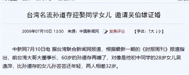 新娘是他初中同学的女儿吴逸萍,其时唯独28岁,比他的女儿孙芸芸还小3岁。