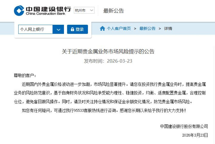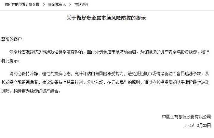 市集暖意融融,但风险也箝制残忍。近期贵金属价钱剧烈波动,从一周前43年来最惨烈的单周暴跌,到如今的强势反弹,“过山车”式的行情,也让市集抵抗气性显赫上升。在此布景下,ued中国官网中国工商银行、中国银行、中国拓荒银行、中国民生银行等多家银行,纷繁发布贵金属市集风险提醒公告,用最贴心的提醒,督察投资者的资产安全。