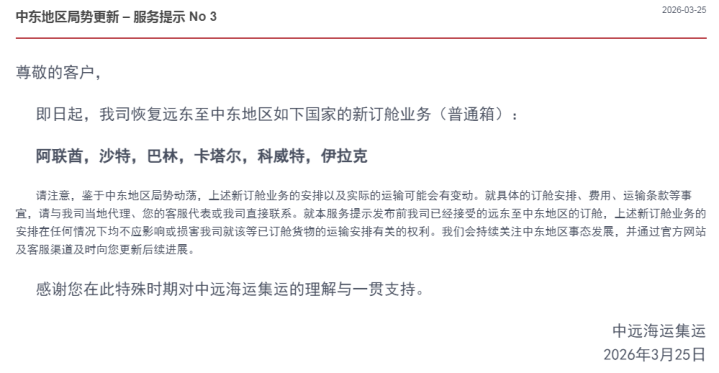 3月25日,中远海运集运文告,即日起归附远东至中东地区多个国度的新订舱业务(平凡箱),包括阿联酋,沙特,巴林,卡塔尔,科威特,ued官方网站伊拉克。