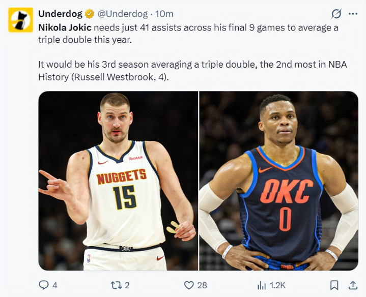 凭据数据统计,约基奇余下的9场比赛唯一送出41次助攻,约基奇就完成场均三双,那么他将承接2个赛季达成场均三双历史第二东说念主,威少曾承接四个赛季达成场均三双,约基奇只差2个赛季就追平威少并排历史第一。