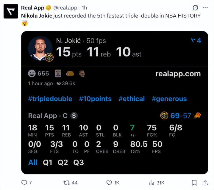 这场比赛约基奇又完成多项记载:1.约基奇18分钟完成三双历史第五快;