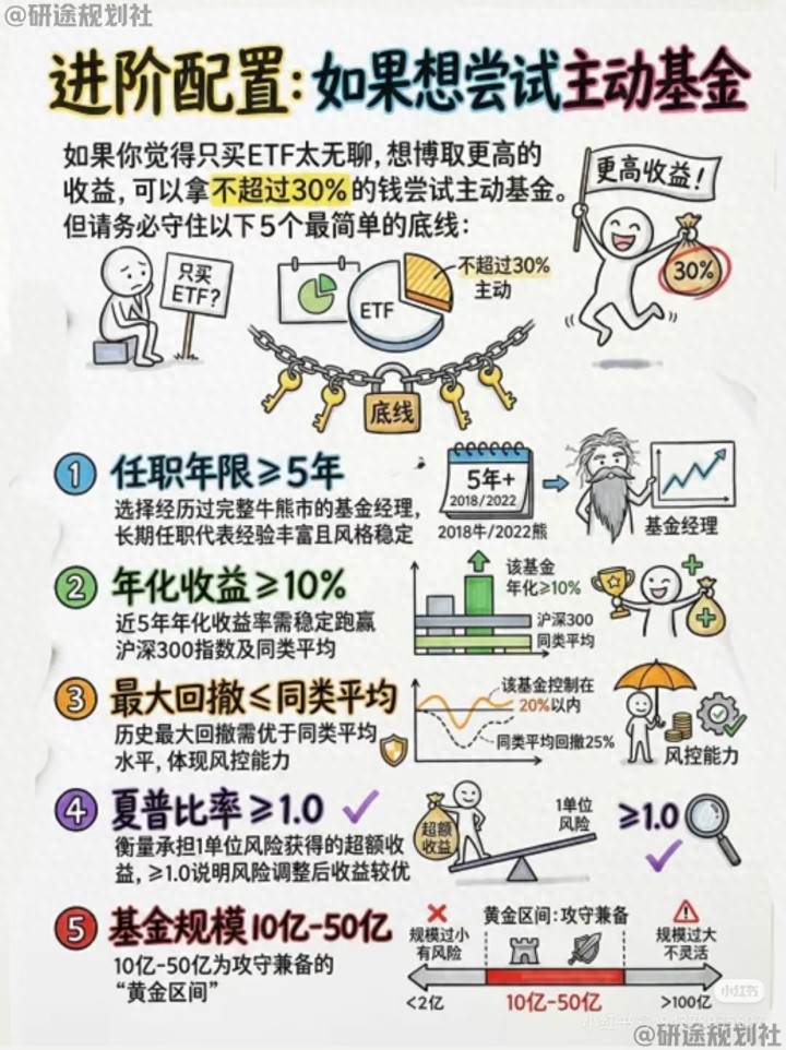 拿不跨越30%的钱尝试主动基金,剩下70%+,老诚笃实买宽基ETF打底!