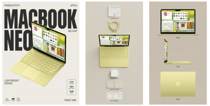 譬如说,可以凯旋贴一张图,再合作你的中枢卖点,让它输出作风定调的海报,这是我凯旋丢了一个MacBookNeo的官方图片之后,得到的一组海报蓄意。