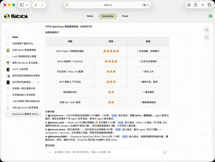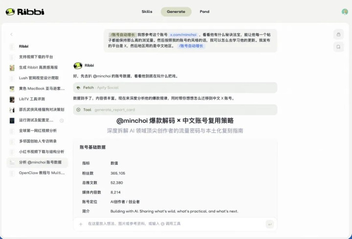 当内容创作遇上AIAgent,Ribbi带来的23个手段正在从头界说创作历程。从账号分析到视频切片,从趋势跟踪到海报生成,这款专为内容创作家蓄意的智能助手将复杂使命流封装成即点即用的手段。本文通过深度实测,揭秘Ribbi怎么完了从灵感赢得到内容发布的全链路自动化,让创作家简直完了'一鱼多吃'的效力改换。