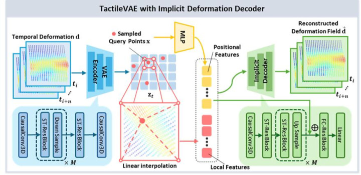 TactileVAE:通落伍空合资编码与隐式函数解码,将高频、无边的触觉3D形变压缩为低维连气儿潜变量示意,如下图所示。该模块不仅在空间上保留细粒度构兵结构(如剪切、法向形变等),还在时分上建模触觉动态变化,从而有用描画构兵经由的演化轨迹。在显贵裁减数据维度与谋略支出的同期,为后续瞻望与截至提可泛化的触觉表征,使机器东说念主能够高效剖析现时构兵景况并快速反应环境变化。