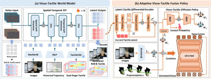 视触觉寰宇模子(瞻望模块):基于双流扩散生成架构,在分享条目按捺下合资建模视觉与触觉的时序演化相干。视觉分支提供全局语义与几何先验,触觉分支聚焦局部构兵动态,两者在潜空间中协同对都,从良友毕对昔日触觉信号的高质地瞻望。通过显式建模“构兵发生前—构兵发生中—构兵演化后”的动态经由,该模块使机器东说念主能够提前预判构兵趋势(如行将发生的构兵、构兵强度变化或滑动风险),为行为策动提供前瞻性信息维持。