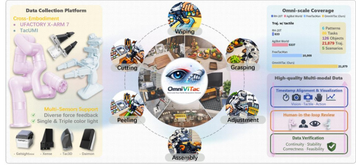 本次它石智航合资六大顶尖机构,从数据底座与本领框架双向攻坚。在数据层面上,团队发布了OmniViTac大规模视触觉数据集,如下图所示,为后续模子锻练筑牢基础。