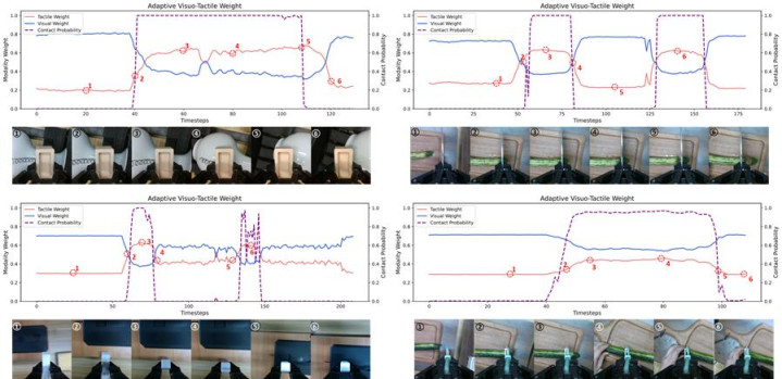 更具深化兴致的是,模子学习到了可移动的构兵动态规矩。如下图所示,模子能笔据瞻望的构兵景况自合乎调度视觉与触觉的权重,并在不同物体和用具下保持踏实确认。这标明机器东说念主正在从“践诺行为”走向“剖析物理构兵”,稳重具备访佛东说念主类的瞻望与反馈协同才气。