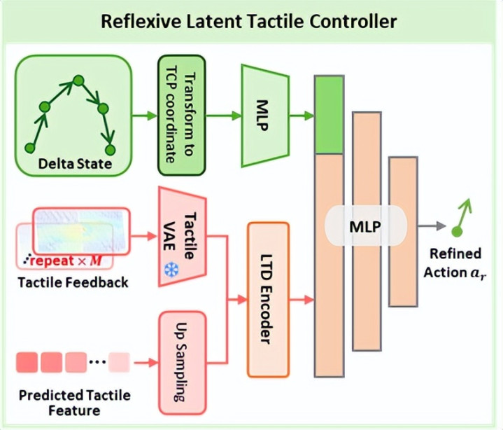 反射式触觉截至器(践诺模块):基于瞻望触觉与及时触觉反馈,在 60 Hz 高频下输出单步修正行为,对慢系统生成的行为序列进行连气儿闭环赔偿。该截至器通过建模触觉纰谬(瞻望–不雅测互异)已毕快速反应,可在构兵扰动、物体偏移或摩擦变化等情况下即时修正践诺轨迹,从而显贵普及操作踏实性与精度。其引入使系统具备访佛东说念主类“触觉反射”的才气,能够有用弥补低频策动带来的滞后性。