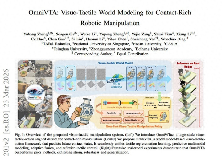 近期,它石智航合资新加坡国立大学、复旦大学、中科院自动化所、清华大学、中关村塾院以及北京航空航天大学六大顶尖机构,推出OmniVTA视触觉操作框架和OmniViTac大规模视触觉数据集并发表磋磨论文,让机器东说念主已毕从被迫感知,到对触觉进行主动瞻望和闭环精确截至,迈出颖悟操作的要害一步。