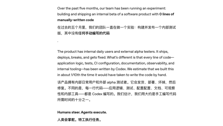 然后我把著述仔细看了一遍,发现不是娇傲,是竟然。三个工程师,五个月,一百万行代码,委派了一个真实居品,有真实用户在用,能闲居发布、部署、出bug、被树立,一皆由AI在那套系统里完成,效率大略是传统东说念主工的十倍