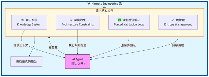 它不是一个器具,不是一个框架,更不是一个Prompt模板。它是一套围绕AIAgent运行的系统,包括照应、反馈、考据和抓续清算这几个部分。2026年头,这套作念法有了一个厚爱的名字:HarnessEngineering。