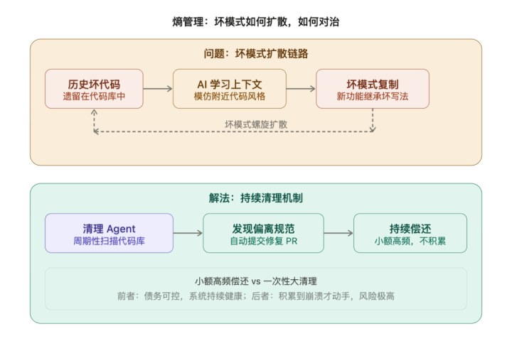 AI生成代码的时候,有一个很坏的民风,即是复当代码库里已有的时势,包括坏的时势。要是你的代码库里有一段写得很烂的代码,AI在独揽写新功能的时候,可能会效法那种写法,然后坏的时势就扩散了。解法是建设一套按期运行的清算机制,后台有有益的Agent周期性扫描代码库,找到偏离设施的场所,自动提交树立。时候债务不要等积攒到崩溃才还,小额高频抓续偿还,效率比一次性大清算好得多。