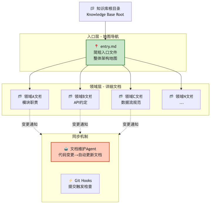 AI要在一个复杂表情里干活,它得知说念全体架构是什么、各模块的职责是什么、API商定是什么。这些信息不是靠一个大文献给它,而是靠一套分层的文档结构。一个粗陋的进口文献算作舆图,指向各个规模的厚爱文档,AI按需取用。更要津的是,这套文档要跟代码保抓同步,代码变了,文档随着变,以致不错有益跑一个”文档一样Agent”来作念这件事。
