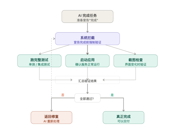 在你的职责流里加一个考据要领,任何任务在宣告完成之前,必须跑考据,哪怕仅仅最基本的冒烟测试。