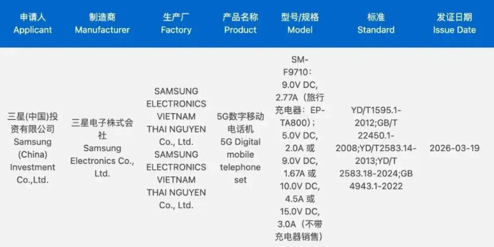 除此除外,型号为 SM-F9710、SM-F9760 的两款三星旗下手机在最近通过了认证。认证信息深入,这两款新机均支捏 45W 快速充电法式。