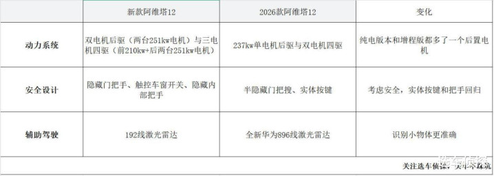 新款阿维塔12的变化主要聚首在底盘智能截止和提拔驾驶硬件的改变上,华为896线激光雷达的加入,让新款的智驾用起来更安全。同期,针对门把手、实体按键等安全层面的问题,阿维塔进行了调整,但短板是价钱依旧偏高,30万以上商场品牌影响力有限。