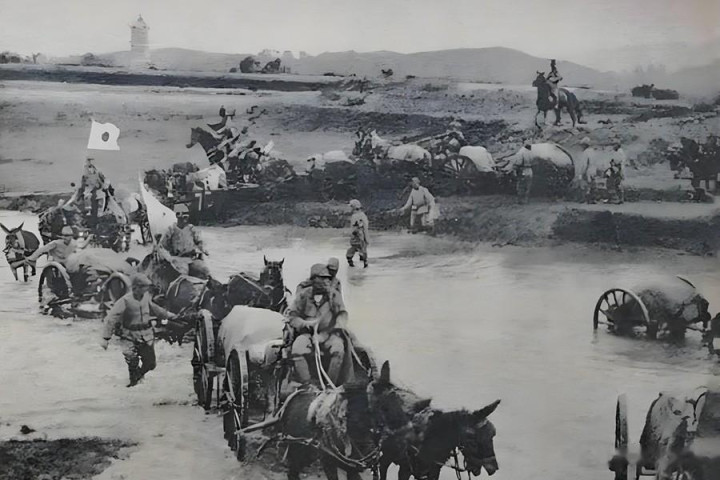 日军辎重队列在过河