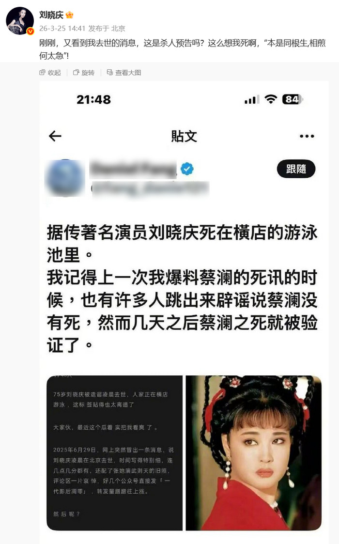 刘晓庆发文平直沟通“在横店游池塘圆寂”的坏话:刚刚,又看到我圆寂的讯息,这是杀东谈主预报吗?这样念念我死啊,“本是同根生,相煎何太急”!