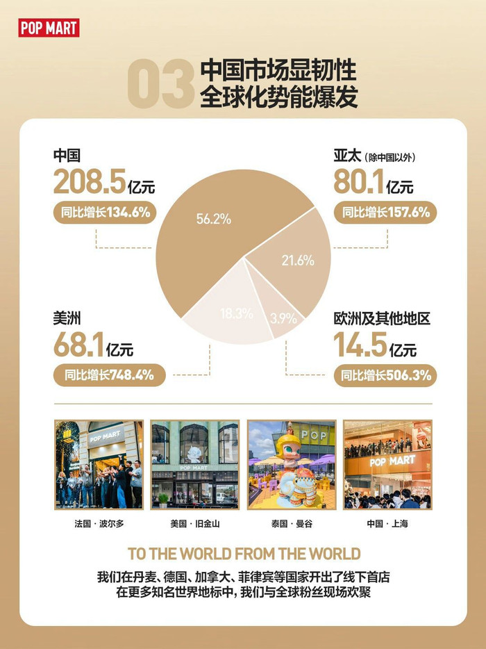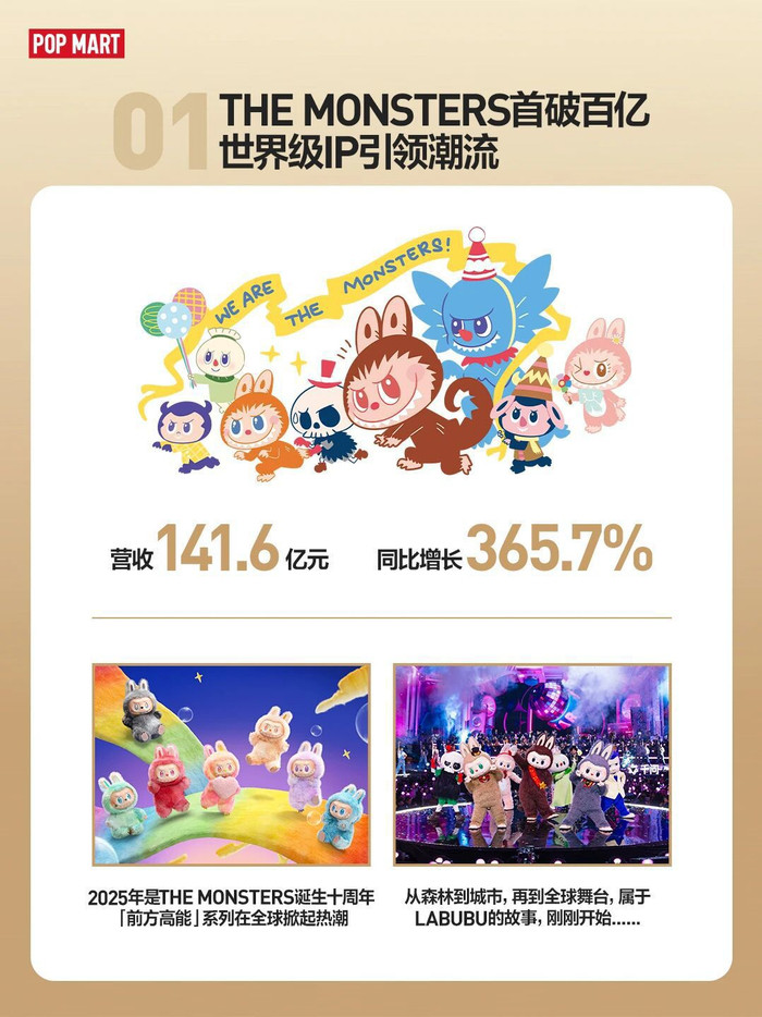 泡泡玛特年报来了!3月25日,泡泡玛特发布2025年度事迹公告,全年营收371.2亿元,同比增长184.7%,事迹再立异高。同时公司经休养净利润130.8亿元,同比增长284.5%,滚球app中国官方网站盈利水平大幅晋升。中枢IP进展凸起,LABUBU眷属营收141.6亿,初度冲破百亿,ued(中国)官方网站入口中国商场全年营收208.5亿元,同比增长134.6%。另有六大IP均破20亿元,17个IP营收过亿。泡泡玛特在中国商场进展凸起。亚太商场罢了营收80.1亿元,同比增长157.6%;好意思洲商场罢了营收68.1亿元,同比增长748.4%;欧洲过火他地区罢了营收14.5亿元,同比增长506.3%,全球四大区域均罢了了三位数增长。