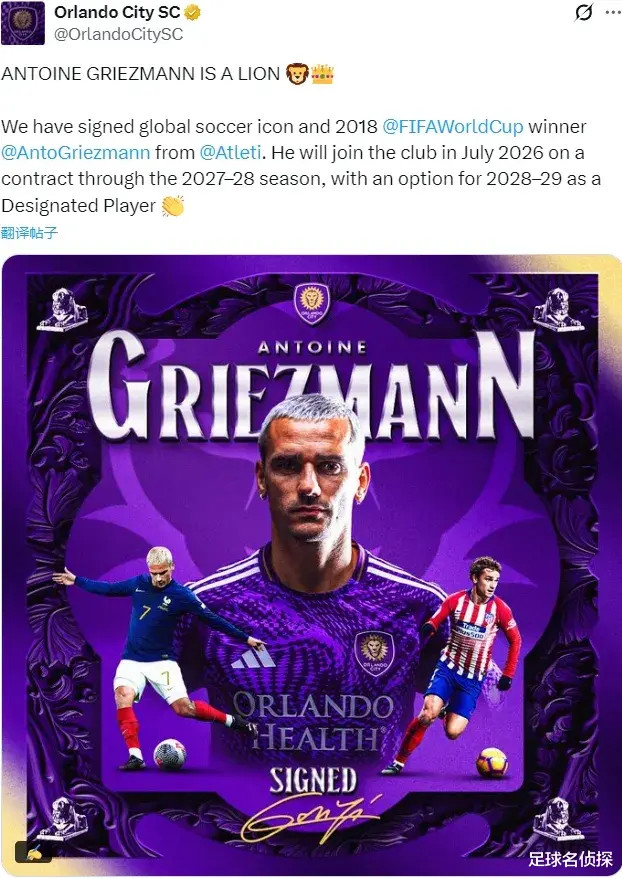 官方:奥兰多城文告和马竞就格列兹曼的交游达成了左券,这名球星将在本年7月份负责登陆MLS,交游为解放转会,法国东说念主将签下一份2028年到期的2年合同,附带延迟一年条件。