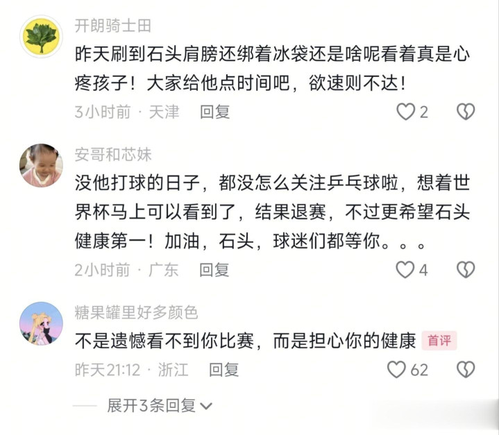 浙江这位网友他是这么说的:不是缺憾看不到你比赛,而是惦记你的健康。