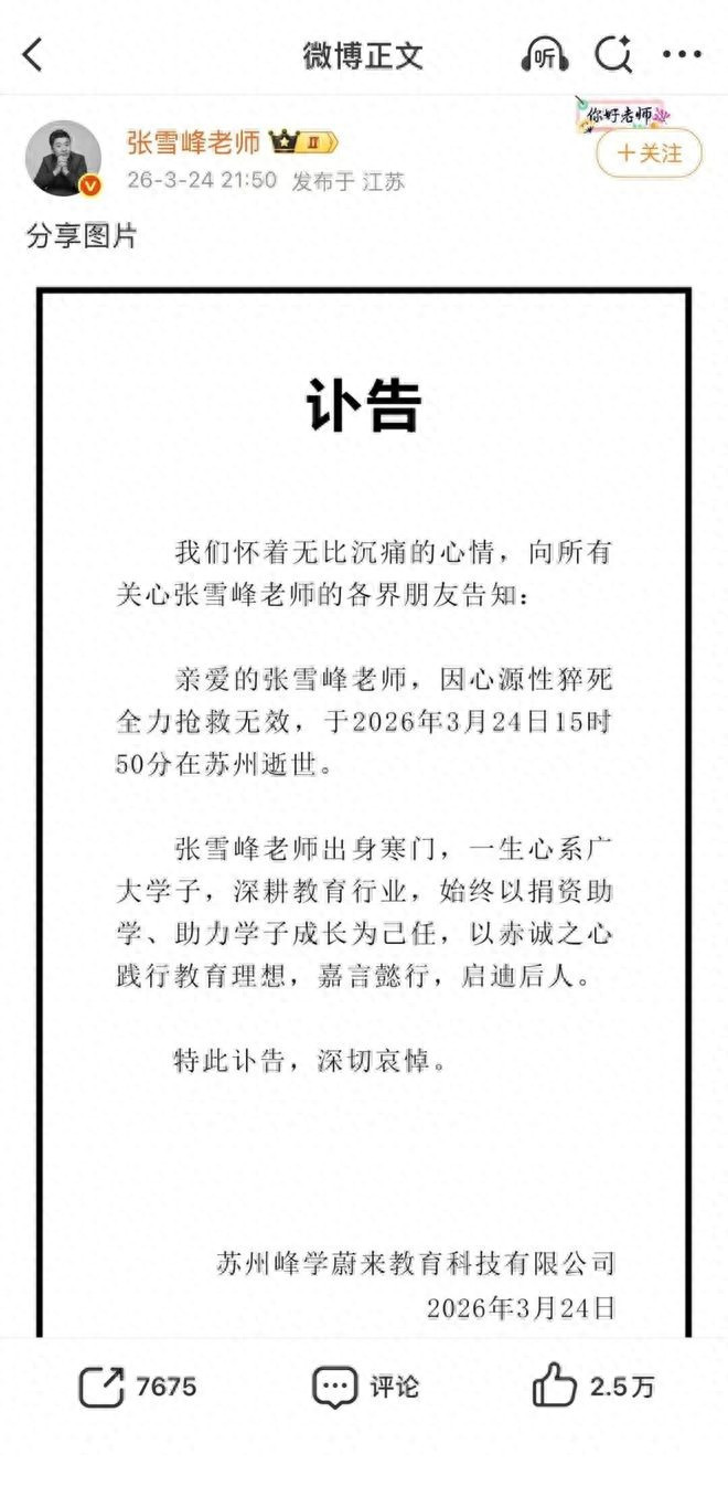 2026年3月24日晚间,苏州峰学蔚来种植科技有限公司通过官方渠谈发布讣告,阐发着名升学筹划导师、公司创举东谈观点雪峰,于当日15时50分在苏州因心源性暴毙经全力抢救无效毕命,享年41岁。音讯仍是发布,速即登上全网热搜,无数网友、学子与家长纷纷抒发戚然,一场对于生命、健康与高强度责任的斟酌,随之席卷外交平台。