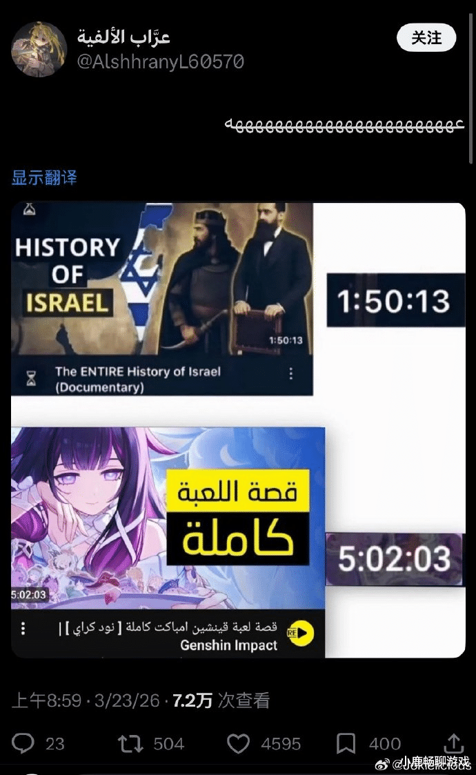 一张对比图,引爆磋商区。梗的发源是一张平方的视频截图对比。图的上半部分,是某地的历史概览视频,时长标注为1小时50分钟;下半部分则是《原神》纳塔地区的竣工剧情书册,时长冲到了5小时。