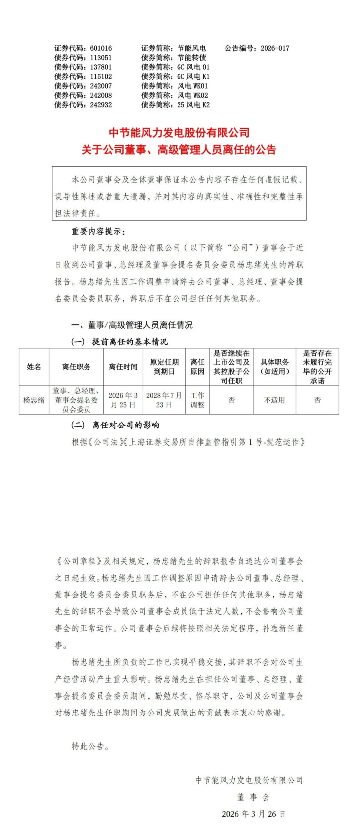 风芒动力获悉,3月25日,节能风电发布对于公司董事、高等处治东谈主员离任的公告公告。