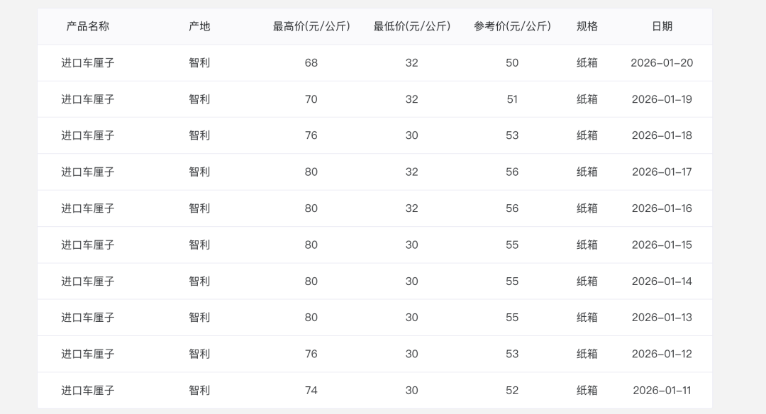 事实上,车厘子价钱在本月资格了一定的波动。广州江南果菜批发商场数据披露,1月7日于今,该商场的入口车厘子价钱波动较为赫然,1月7日,车厘子最高价为每公斤68元,最廉价26元每公斤。随后价钱一起高涨,1月13日至1月17日,车厘子最高价来到每公斤80元,最廉价32元每公斤,18日至20日,车厘子最高价又在三日内跌落回每公斤68元,最廉价32元每公斤。
