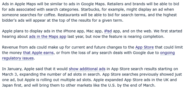 [CNMO科技音信]据外媒报说念,苹果公司盘算最快于本年夏令在AppleMaps搜索效果中植入告白。知情东说念主士暴露,苹果可能在本月内认真文告这一盘算,旨在通过告白业务弥补诓骗商店收入波动带来的潜在缺口。