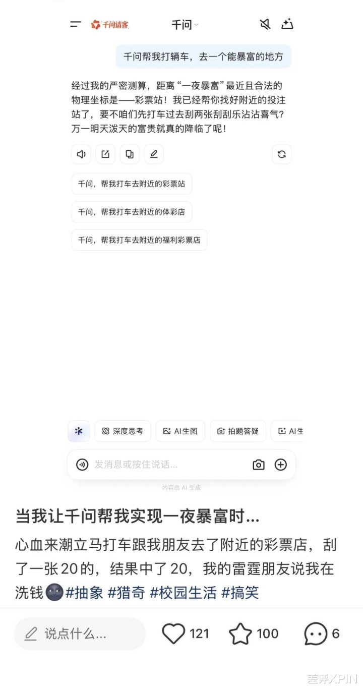 这个网友说的是:“千问帮我打辆车,去一个能暴富的地点!”