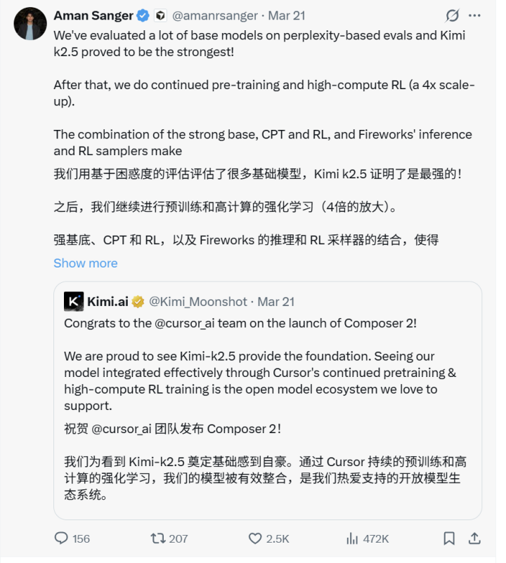 要知说念,此前Cursor在公告中但是绝口未提Kimi,发奋营造自研的叙事。但面对铁案如山,Cursor的都集独创东说念主AmanSanger不得不承认,团队如实是在KimiK2.5的基础上,进行了握续预检会和强化学习,并承认“一启动没在博客中说起Kimi这个底座,是个核定”。