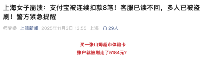 上不雅新闻报说念,有东说念主购买山姆会员卡,因为清楚账户密码或通达免密支付,账户被盗刷。