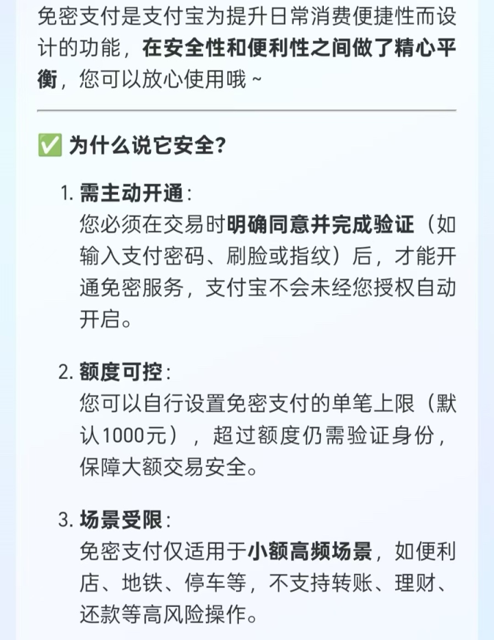 支付宝所谓的安全,是说免费支付需要用户主动通达,并且单笔免密上限是1000元,适用的场景是小额高频场景。