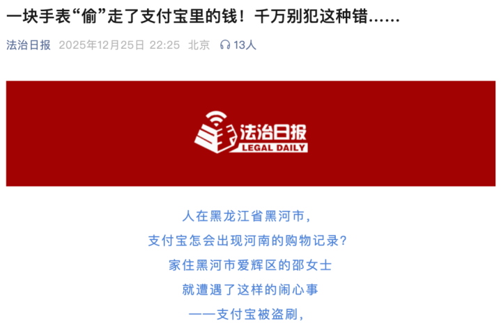 法治日报报说念,有东说念主买了智高腕表绑了支付宝,退货后莫得解绑支付宝,被东说念主用支付宝付款码结账,盗刷5300多元。
