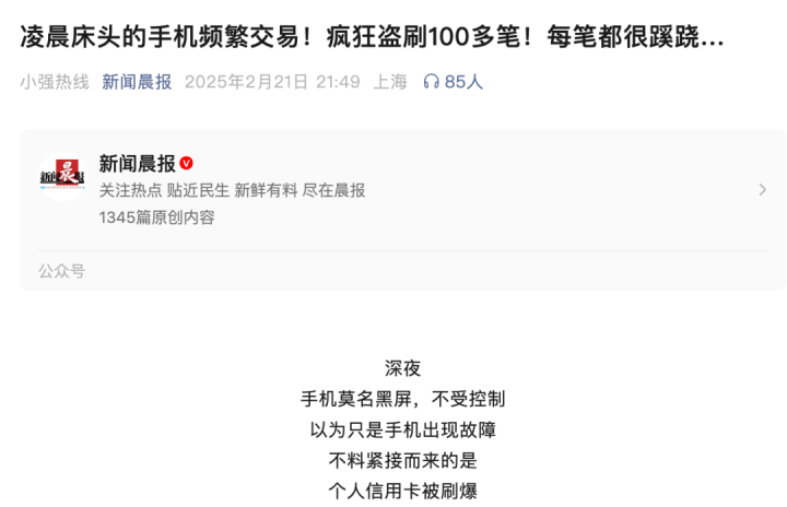新闻晨报报说念,有东说念主手机放在床头,凌晨被盗刷100多笔,总和接近5万元。不仅银行卡被盗刷,花呗备用金也被建议来糜掷。