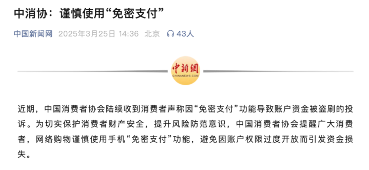 旧年3月,因为投诉免密支付导致账户资金被盗刷的案例太多,中国糜掷者协会公开辅导糜掷者,收集购物严慎使用“免密支付”,幸免权限过度灵通激发资金赔本。