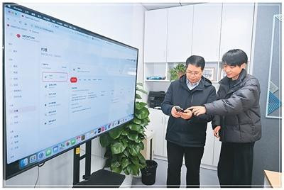 近日,在中国(南京)软件谷“质能·工坊”OPC社区,工夫东谈主员装配完开源AI智能体“龙虾”后与用户(左)交流。