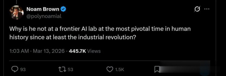 为什么在东说念主类历史上——至少自工业翻新以来最要害的时期,他(卡帕西)莫得出目下一个前沿的东说念主工智能实验室?