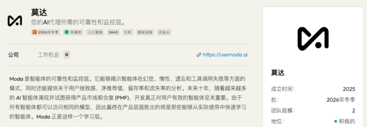 Moda要管制的,即是这类问题。YC对它的形容也很平直:它是给AIagents用的可靠性和监控层。