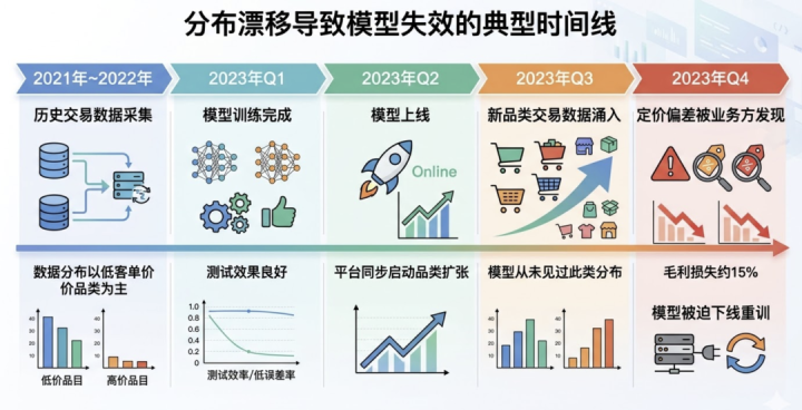 用一个真实场景来评释:某电商平台在2023年用历史交游数据磨砺了一个智能订价模子,磨砺数据的时刻窗口是2021年到2022年。但2023年平台作念了一次大界限的品类推广,新增了无数客单价在500元以上的高端商品。这些商品的用户购买行为模式与原有品类统统不同,但模子统统莫得见过这类交游数据,当然也无法为这部分商品给出合理的订价提议。