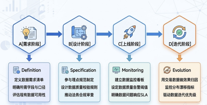 说到这里,我思平直给出一个可践诺的行动框架。作为AI居品司理,你需要在神色的四个要道节点主动介入交游数据的处分,而不是等着数据团队”准备好了再来找你”。