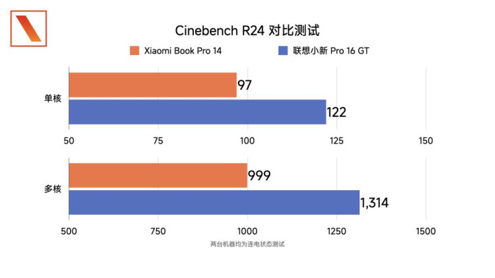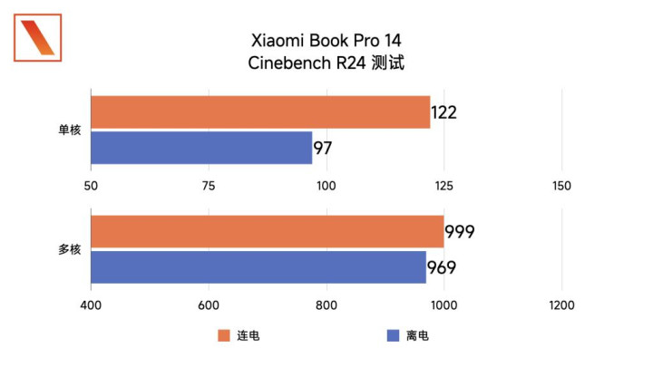 先望望跑分。Cinebench R24 测试,Xiaomi Book Pro 14 连电单核 122 分,多核 999 分;离电单核 97 分,多核 969 分。