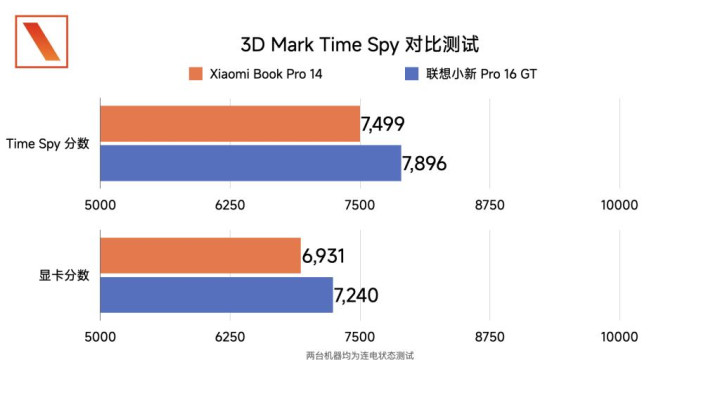 3D Mark 的 Time Spy 要领,连电得分 7499 分,显卡分数 6931 分,CPU 分数 14021 分;离电得分 6949 分,显卡分数 6401 分,CPU 分数 13501 分。