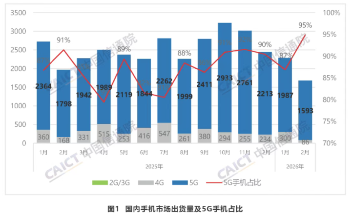 3月25日音书,据中国信通院最新发布的敷陈走漏,2026年2月国内商场手机出货量1678.9万部,同比着落14.6%,其中5G手机1593.1万部,同比着落11.4%,占同时手机出货量的94.9%。